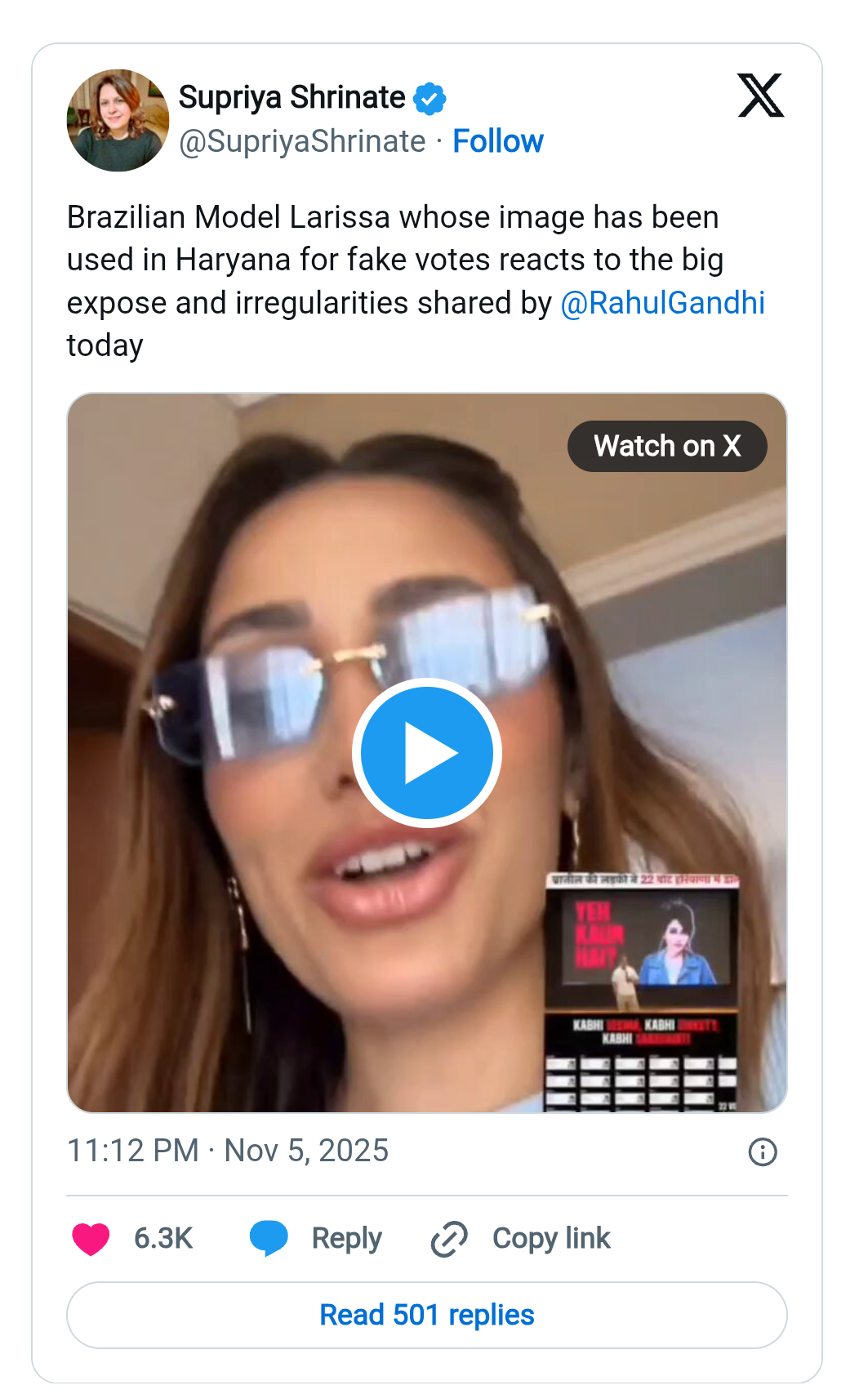 वीडियो में, लारिसा ने बताया कि एक रिपोर्टर ने तो उनके वर्कप्लेस पर भी कॉन्टैक्ट किया था। साथ ही, भारत में चुनाव में उनके कथित पार्टिसिपेशन के बारे में कमेंट लेने के लिए इंस्टाग्राम पर भी उनसे संपर्क किया था। उन्होंने आगे कहा कि एक दोस्त ने मुझे एक और तस्वीर भेजी है, आप यकीन नहीं करेंगे,” और इस सिचुएशन को ‘अविश्वसनीय’ और ‘अजीब’ बताया। कांग्रेस नेता राहुल गांधी ने भारतीय जनता पार्टी और चुनाव आयोग पर “वोट चोरी” का आरोप और तेज़ कर दिया है, और कहा है कि 2024 के हरियाणा विधानसभा चुनावों में 25 लाख फर्जी वोट डाले गए थे।