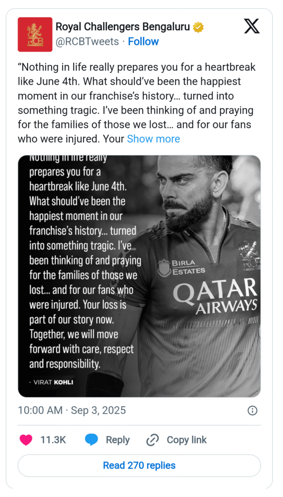 “जिंदगी में कभी-कभी ऐसे पल आते हैं जिनके लिए आप बिल्कुल तैयार नहीं होते। 4 जून भी ऐसा ही दिन था। हमारी फ्रेंचाइजी के लिए जो दिन सबसे खुशहाल होना चाहिए था, वो एक दुखद घटना में बदल गया। मैं उन सभी परिवारों के लिए प्रार्थना करता हूं जिन्होंने अपनों को खोया और उन फैंस के लिए जो घायल हुए। आपका दर्द अब हमारी कहानी का हिस्सा है। हम सब मिलकर आगे बढ़ेंगे और पहले से ज्यादा संवेदनशील और जिम्मेदार रहेंगे।”